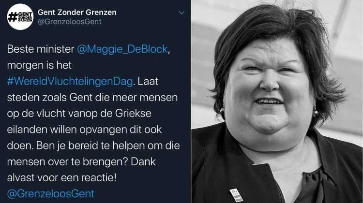 “Beste minister @Maggie_DeBlock, morgen is het #WereldVluchtelingenDag. Laat steden zoals Gent die meer mensen op de vlucht vanop de Griekse eilanden willen opvangen dit ook doen. Ben je bereid te helpen om die mensen over te brengen? Dank alvast voor een reactie! @GrenzeloosGent”