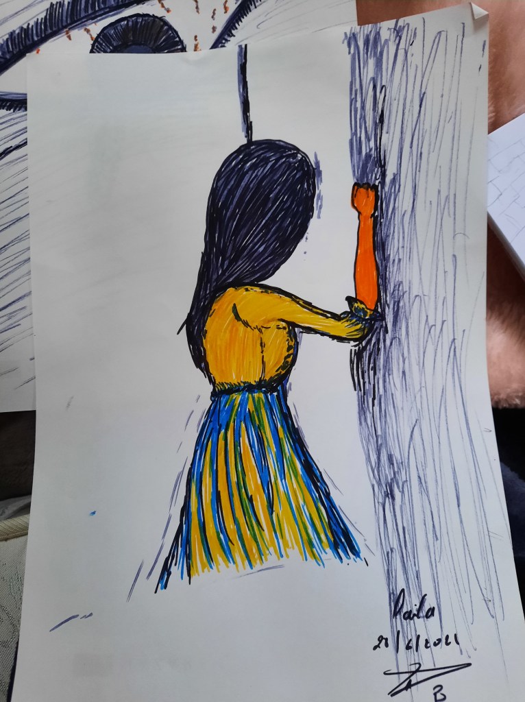 Haar buurvrouw Laila toont me een tekening die ze zelf gemaakt heeft: “Cette femme, c’est nous. We zijn droevig en staan tegen de muur. Het is niet omdat we lachen, dat we gelukkig zijn.”
