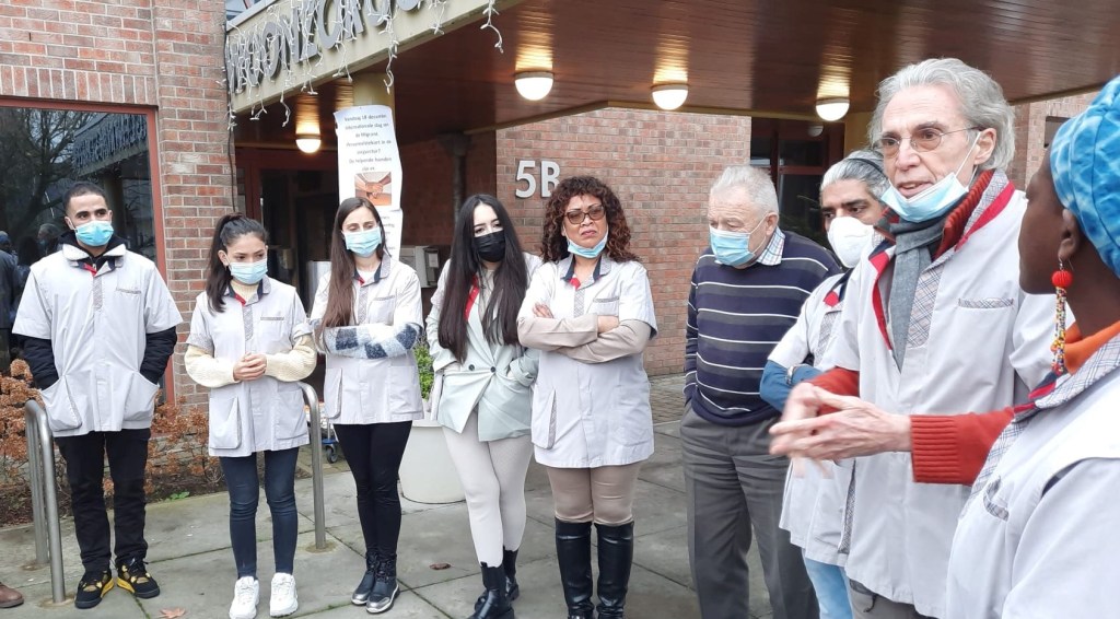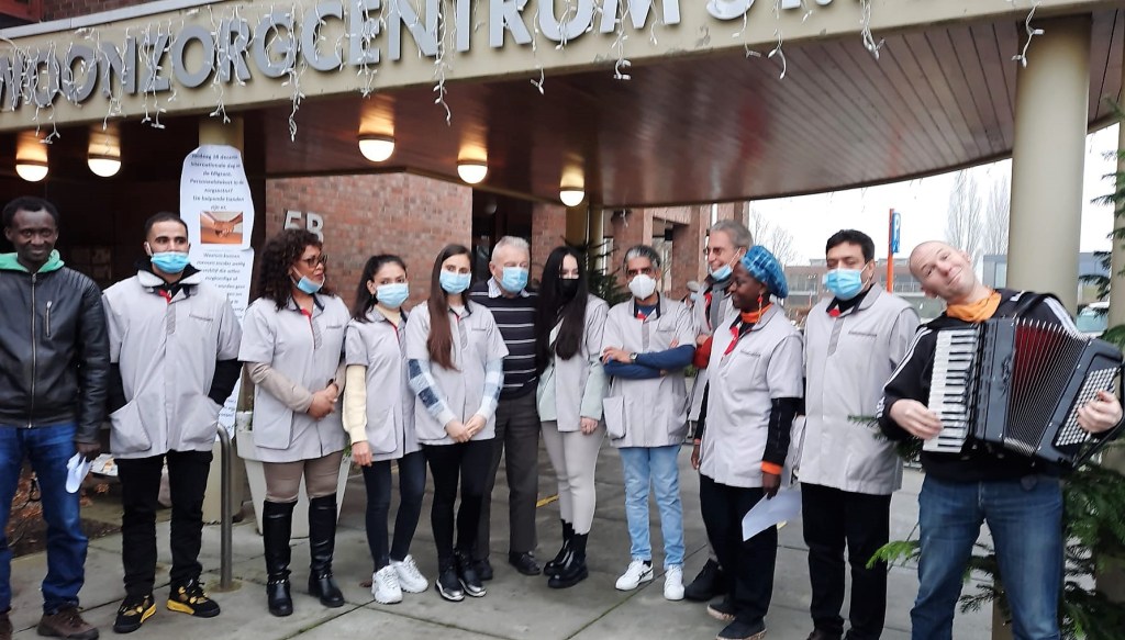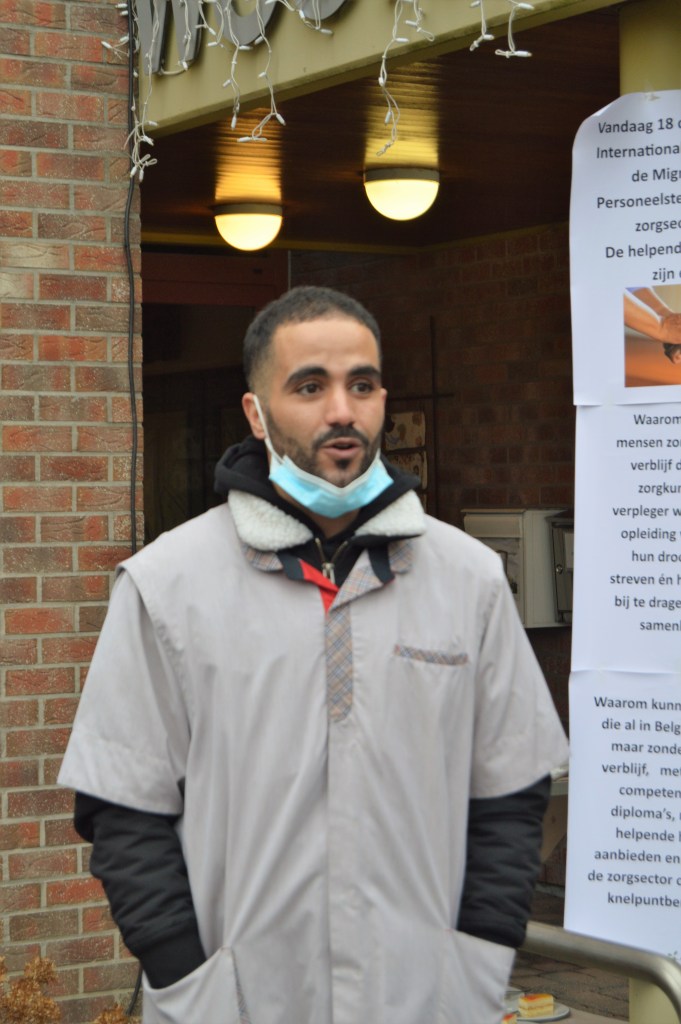Ze willen heel graag werken in de zorg, maar ze mogen niet. Enkele mensen zonder papieren boden op 18 december, de Internationale Dag van de Migrant, hun diensten aan bij het woonzorgcentrum Sint-Pieter in Lochristi. Ze werden er warm onthaald door de directie, het personeel en de bewoners. Met de actie vragen we aan de bevoegde beleidsmakers om een pragmatischer en gedurfder arbeidsmigratiebeleid te voeren.